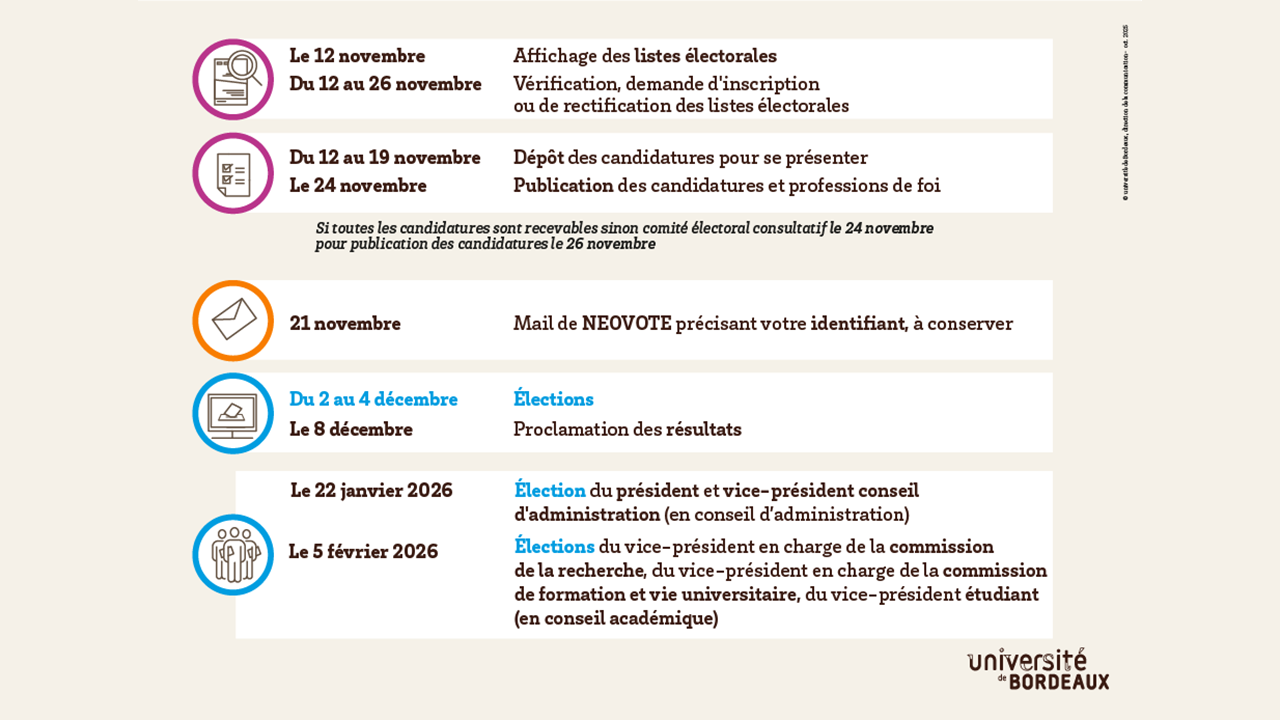 Les personnels et les étudiants sont appelés à élire leurs représentants pour les élections par vote électronique du mardi 2 décembre 2025, 9h au jeudi 4 décembre 2025, 17h, sans interruption.